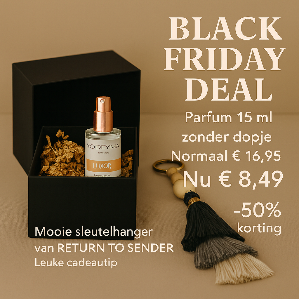 De geliefde Yodeyma Luxor 15 ml (zonder dopje) wordt tijdelijk geleverd samen met een prachtige handgemaakte sleutelhanger van Return to Sender. Een perfecte combinatie van geur & design — ideaal als cadeautje of om jezelf te verwennen.