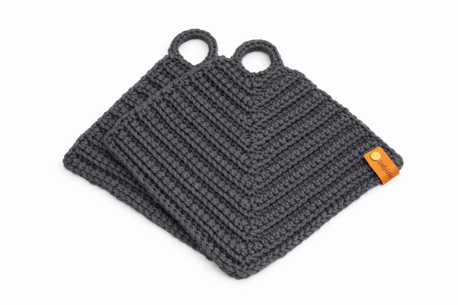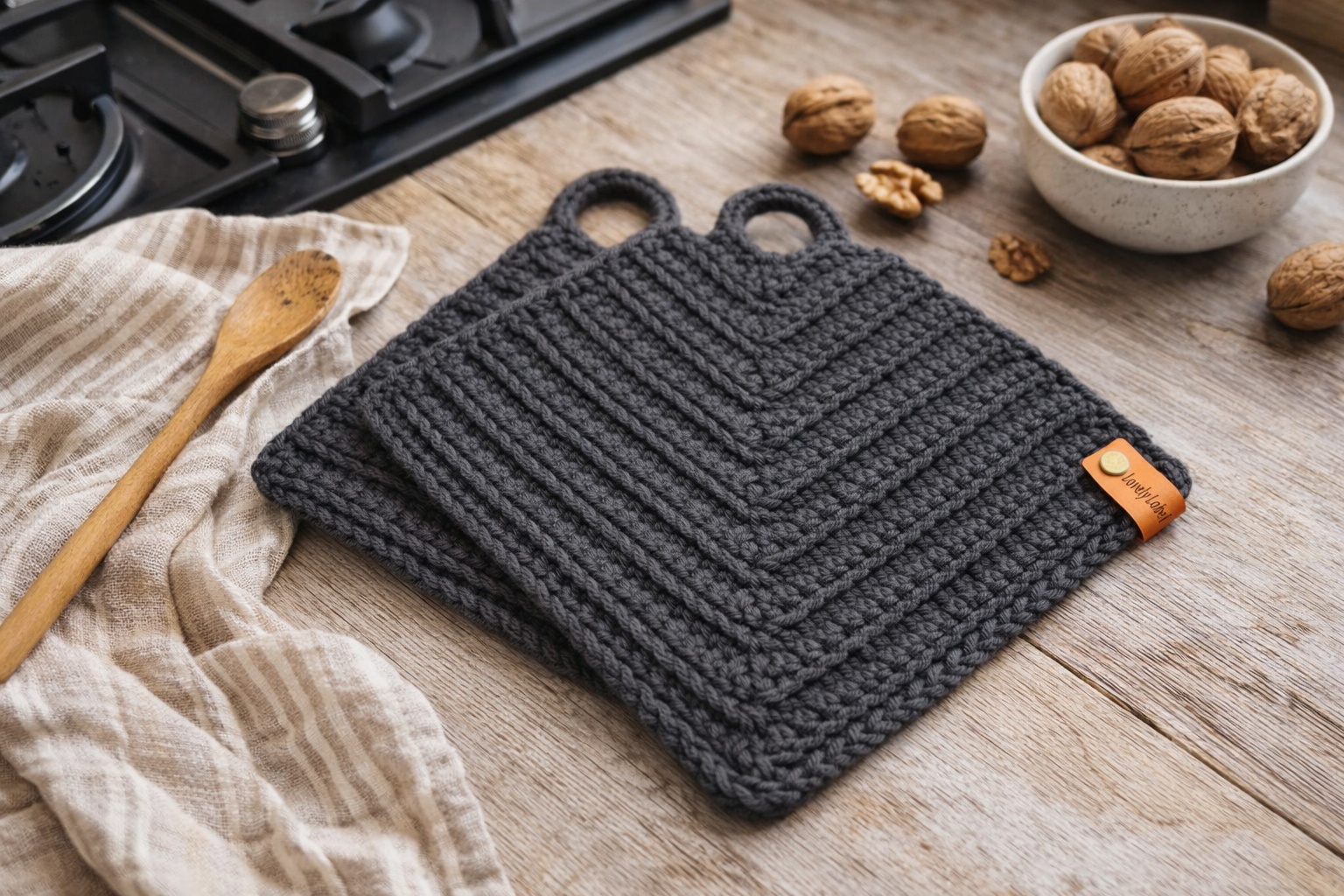 Twee handgemaakte retro pannenlappen in Grijs. Duurzaam, stijlvol en perfect als keukendetail of cadeautje.