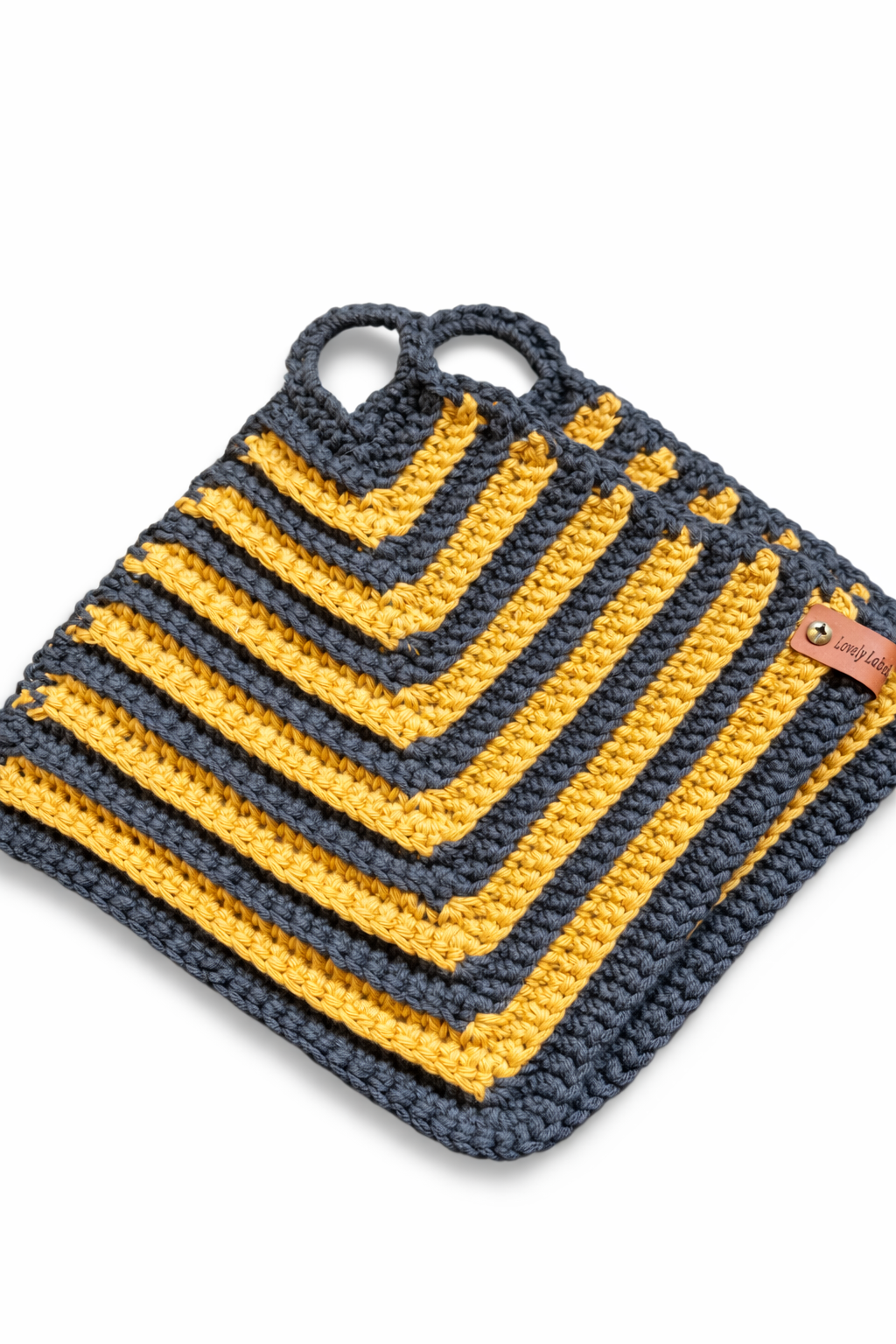 Hoe leuk is dat , gehaakte Retro pannenlappen- Grijs/ Mosterd in een nieuw jasje. De pannenlappen hebben een Retro look , je moeder of je oma kent ze vast nog wel.