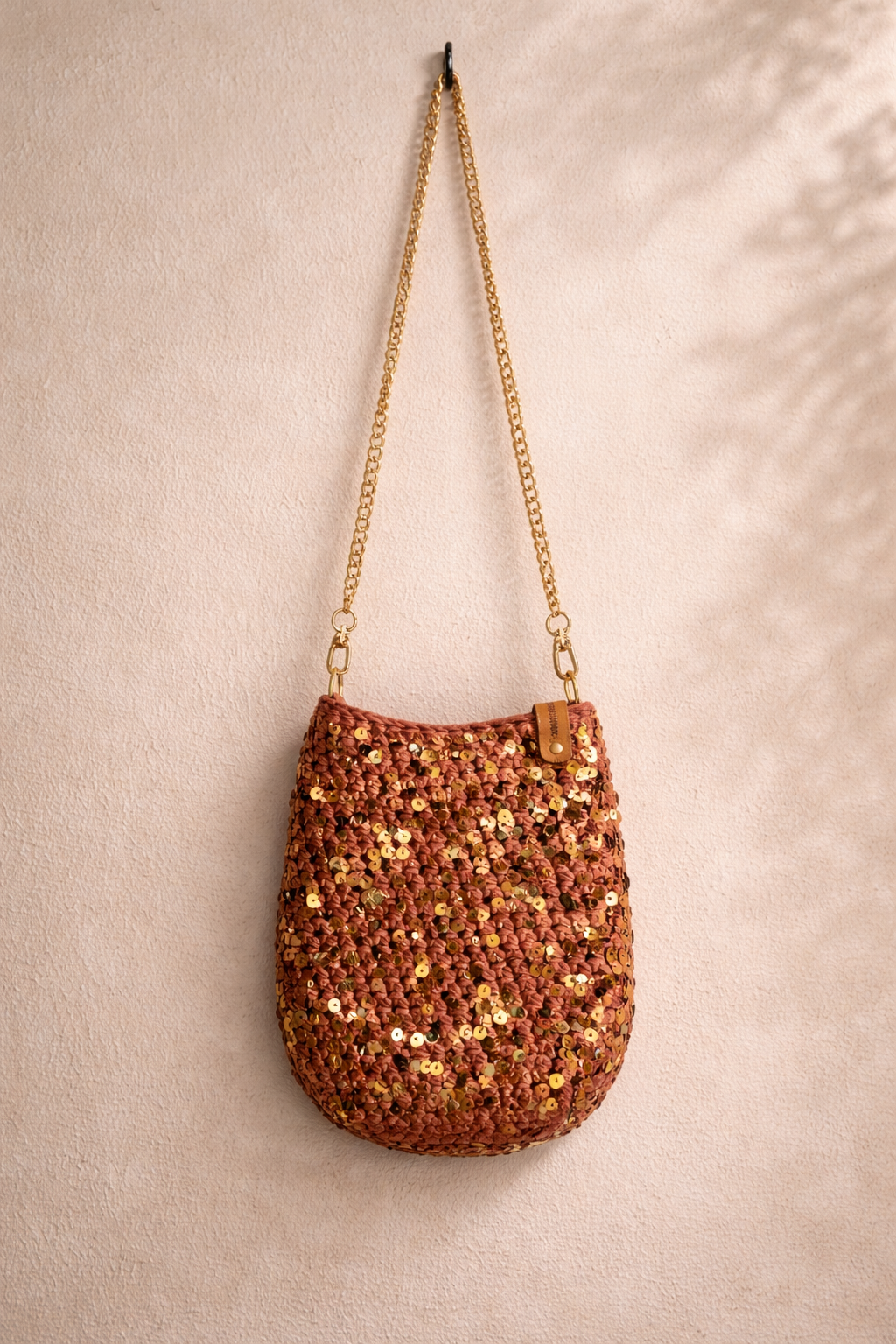 De combinatie van de subtiel gehaakte basis, sprankelende details en een goudkleurige ketting zorgt voor een luxe maar speelse uitstraling.
