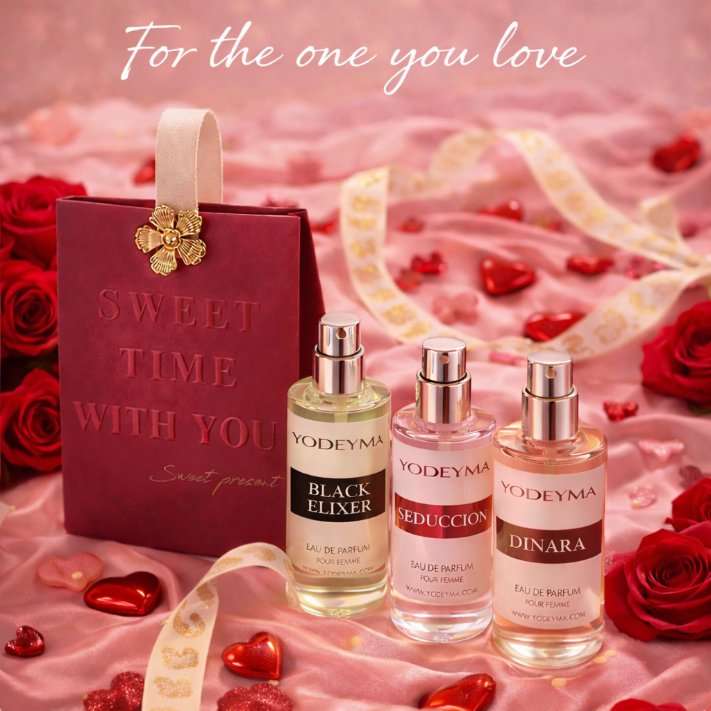 De Sweet Time With You Valentijn Cadeauset is een romantische parfumset met drie luxe mini parfums van Yodeyma, prachtig verpakt in een stijlvolle cadeauverpakking.